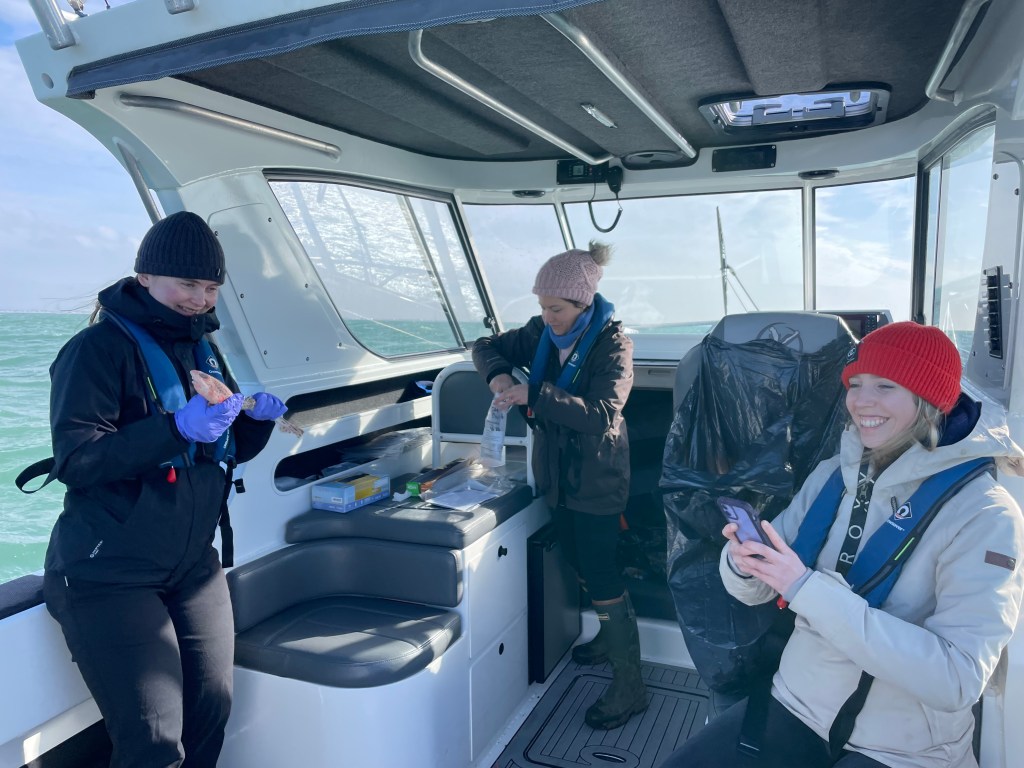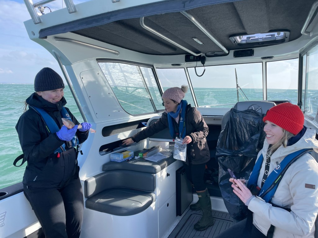 One of the most important elements of our project is to check all our data collection methodologies are efficient and effective. As you may have read in our other blogs, we are collecting the DNA from Smoothhounds and Skates so we can identify them using their genetic profiles. However DNA collection is notoriously messy – particularly when you are dealing with fishing boats that are not only covered in bait, hands and dirty shoes etc, but also moving about considerably too!